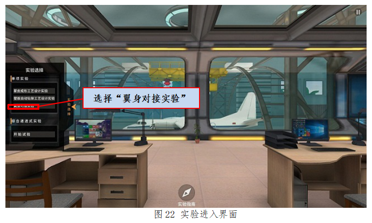 开始翼身对接实验:进入课件,点击界面左边的“实验选择”,拉开实验选择界面,选择“翼身对接实验”(如图22所示)。
