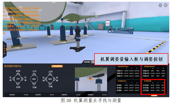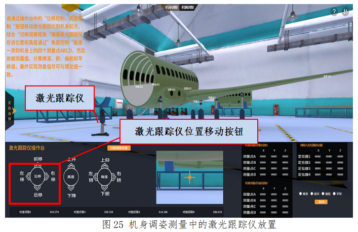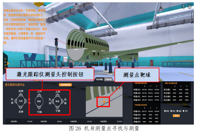 机身调姿激光跟踪仪布站:待机身、机翼放稳之后,首先根据机身、机翼位置布置激光跟踪仪,控制跟踪仪的升降和转向(使用WSAD四个键,分别对应前进、后退、左移、右移)(图25),找到机身的四个测量点。这里,学生需要移动、控制激光跟踪仪,通过该步骤了解激光跟踪仪基本工作原理。