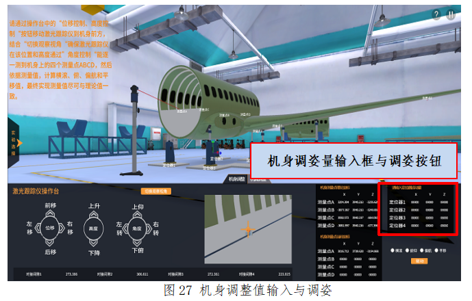 机身调姿计算与调姿驱动:当机身的四个点全部测量完毕后,通过姿态解构的计算方式,依次点击横滚、俯仰、偏航与平移,并需要调整的值,输入完毕后点击“驱动”(图27),机身根据输入的值作对应调整,最终完成机身调平。本步骤中,学生需根据机身靶球点测量坐标计算机身调姿运动量,当计算结果错误时,会产生错误的调姿驱动,从而让学生运用巩固课堂所学大部件解耦调姿、机身调姿模式方面的知识,达到主动学习的目的。
