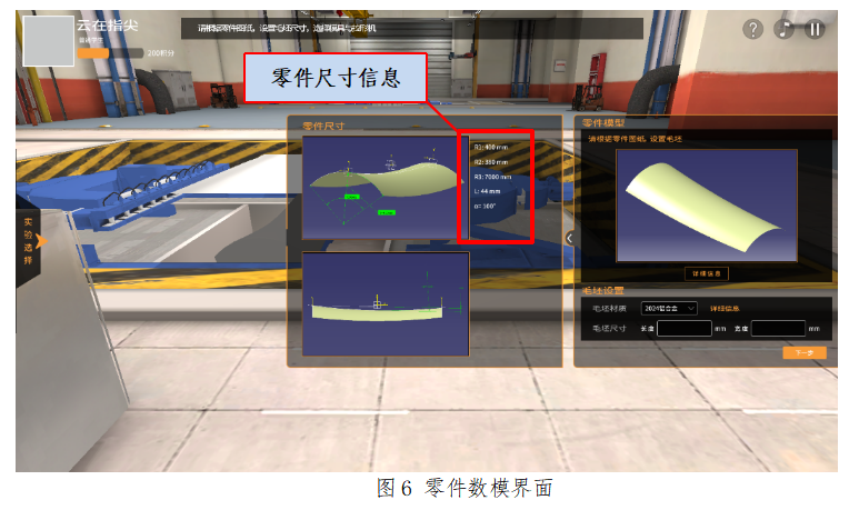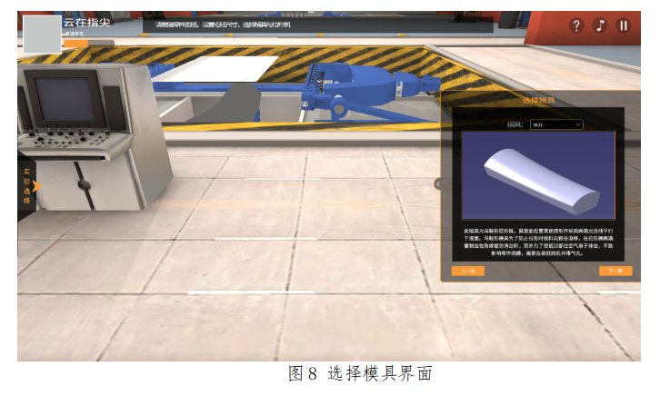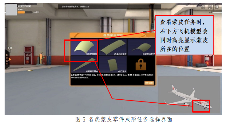 进入蒙皮成形实验操作后,出现各类蒙皮零件成形任务选择界面,如图5所示,可通过右下方飞机数模查看各类蒙皮零件在飞机上的大致位置,使学生了解该零件的定位。图中零件由简单到复杂,简单零件成形实验完成后,复杂零件方可解锁,目的是为了使学生通过循序渐进的实验,锻炼其工艺分析能力。系统随机分配待成形零件,然后点击“随机领取”领取任务,开始实验,系统随机分配任务可以达到“一人一任务”的目的。