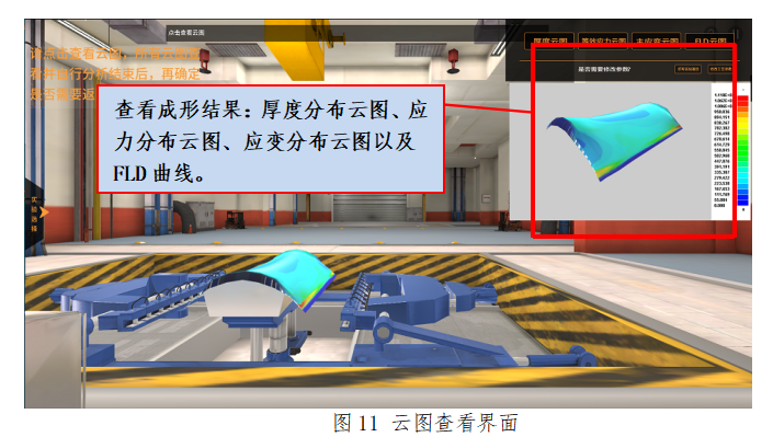系统计算结束后,进入零件成形结果的仿真云图查看界面,如图11所示,可点击右上角选项,查看相应的零件的厚度分布云图、应力分布云图、应变分布云图以及FLD曲线。