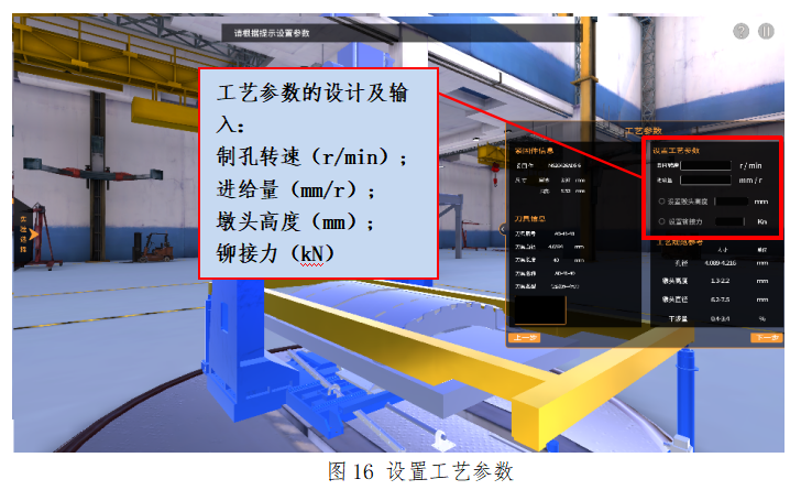 如图16所示,进入设置工艺参数页面,学生线下结合课程和资料进行工艺参数的计算,输入相应的制孔工艺参数和铆接工艺参数(镦头高度和铆接力控制二选一),不同参数将导致不同的钻铆质量,学生通过分析计算进行知识的巩固和工艺设计与分析能力的培养。