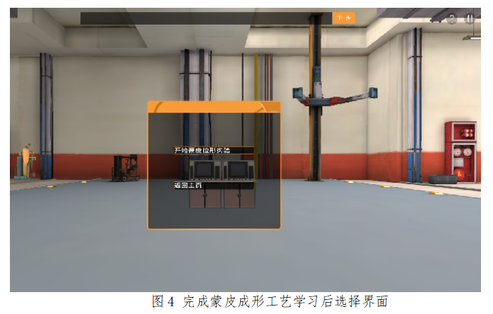 学生选择“01蒙皮拉伸成形工艺过程学习”,模拟拉形机的拉形过程,以便学生通过该项操作来了解拉形机工作原理和拉形过程;该项完成后之后进入如图4所示页面,或者由第一步“实验内容选择界面”直接进入“02蒙皮成形实验操作”,开始实验操作。