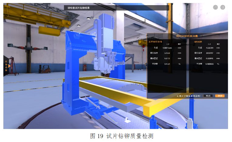 试片钻铆后,如图19所示,进入质量检测页面,根据检测结果确定是否需要修改工艺参数,如要修改,则点击需要修改,不需要修改点击确定,点击确定后进入壁板钻铆动画。通过结果的检测学生可以判定设计的工艺参数是否合理,通过这种方式可培养学生工程问题解决能力和探究能力。