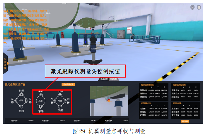 机翼测量点寻找与测量:跟踪仪放置成功后,点击操作台,控制跟踪仪的升降和转向,以找到测量点靶球,右边界面上的黄色十字标对应上测量点,右边的测量点坐标自动获取成功(图29)。由于学生需要再次在小窗口中寻找机翼部件上的激光靶球,确保可测量,使其进一步了解巩固大尺寸激光测量的难点。