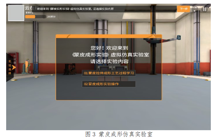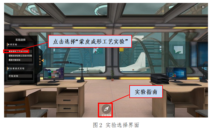 进入实验选择页面,如图2所示,首先要阅读下方的实验指南。单项实验,服务于课程或者学生大创项目,综合递进式实验为综合式的创新型实验,一般服务于学生大创项目或者毕业设计,学生或个人或团队合作模式,以具体的飞机上某部件为对象,分解为零件,完成零件成形到大部件装配的各个环节。单项实验完成后方可进行综合递进式实验。学生点击任一选项,均弹出三个实验按钮:飞机蒙皮成形工艺设计实验、壁板自动钻铆工艺设计实验、翼身对接实验。其中,“单项实验”中,三个实验均为激活状态,可点击任意一个进入相应的实验模块,“综合递进式实验”中,为综合式实验,三个实验必须按顺序完成,首先是“飞机蒙皮成形工艺设计实验”,其次为“壁板自动钻铆工艺设计实验”,最后一个是“飞机翼身对接实验”,第一个实验为激活状态,其他两个实验是灰色,不可激活,只有该实验完成后方可进入下一个实验,直至全部完成。