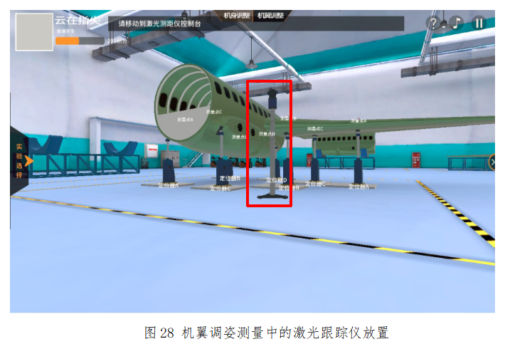 机翼调姿激光跟踪仪布站:待机身调姿完成后,点击激光跟踪仪,拖动到合适的位置,点击地面,放置跟踪仪,并与机身调姿布站相同,对激光跟踪仪进行抬升(如图28所示)。由于学生需要再次移动、抬升激光跟踪仪,使其进一步了解巩固激光跟踪仪基本工作原理与转站原理。