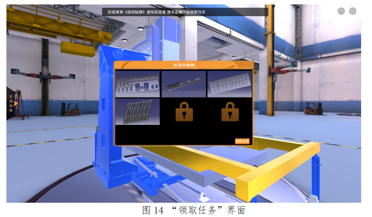 接着进入任务分配页面,如图14所示,点击“领取任务”按钮,开始实验。任务图中壁板零件由简单到复杂,简单壁板实验完成后,复杂壁板方可解锁,目的是为了使学生通过循序渐进的实验,锻炼其工艺分析能力。