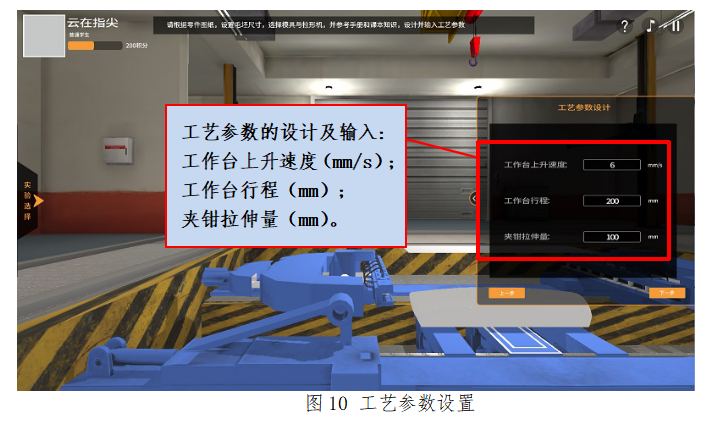 进入工艺参数设置界面,如图10所示,学生通过线下计算和查阅手册,计算工作台上升速度和行程以及夹钳的拉伸量,并在系统中输入计算值。该步骤中,学生需线下主动结合课堂知识、设计手册以及检索相关资料来进行工艺参数的理论计算(初选参数),工艺参数的不同会影响到零件的成形效果,因此学生需不断通过修改工艺参数来成形处质量较好的零件,从而获得优选工艺参数,目的是培养学生工艺分析能力和探究能力。
