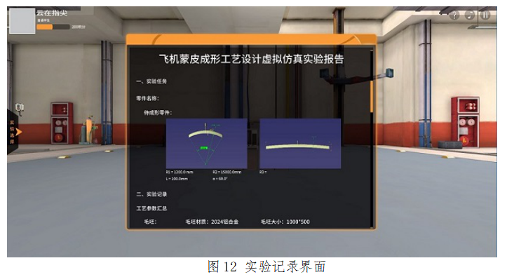 如果对仿真结果满意,点击“否”选项,弹出实验记录页面,,如图12所示,在“实验记录”中填写对云图的分析报告、实验结论以及建议和措施,完成后,点击提交报告结束蒙皮成形实验。